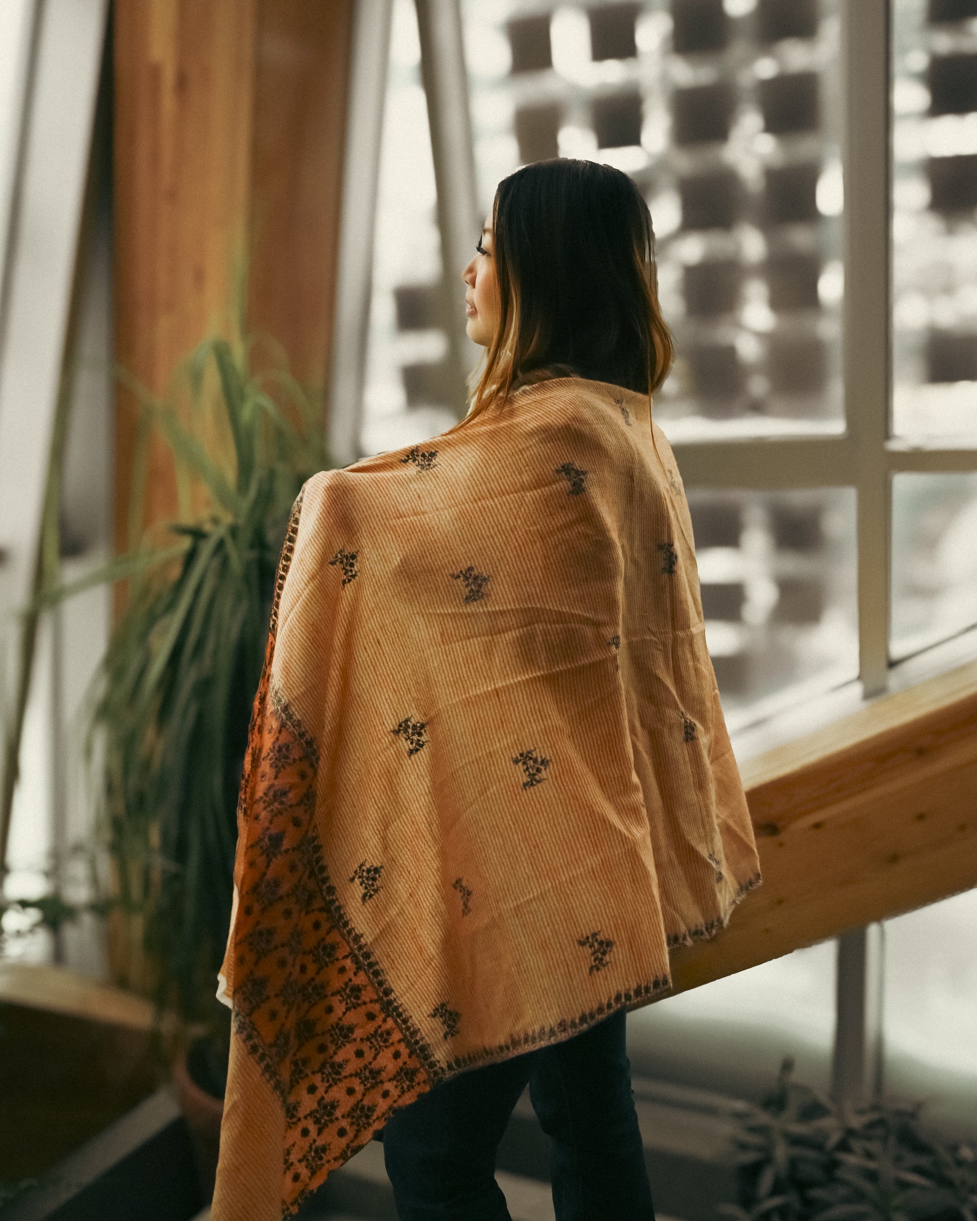 This Pure Pashmina shawl, crafted by Mr. Akhram and his family in their village in Northern India, features traditional Ari embroidery that takes 3 to 6 months to complete.