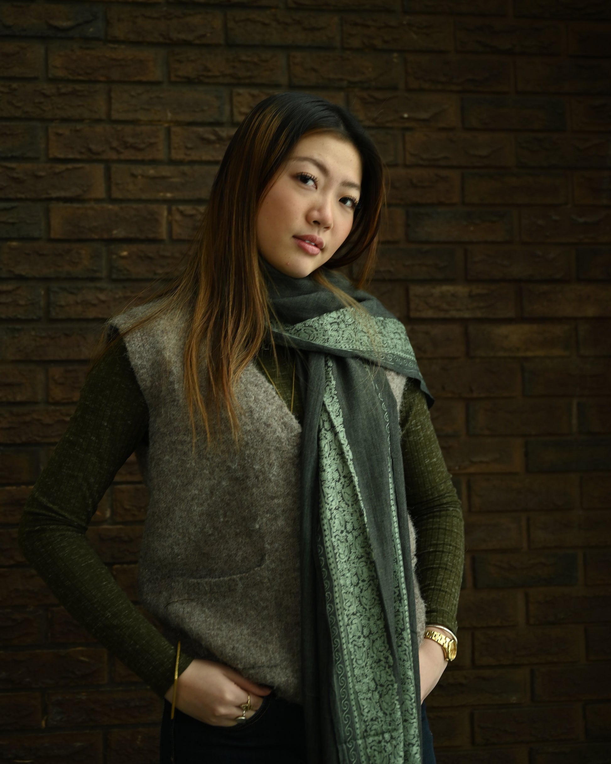 True pashmina is gathered from the Himalayan goat’s winter undercoat, a ritual passed down through generations. The most exquisite fibres are found at the neck: rare, impossibly soft, and long revered by artisans. Wool gathered from the body and neck continues this story of warmth and care, offering a gentler expression of pashmina that remains natural, enduring, and accessible.